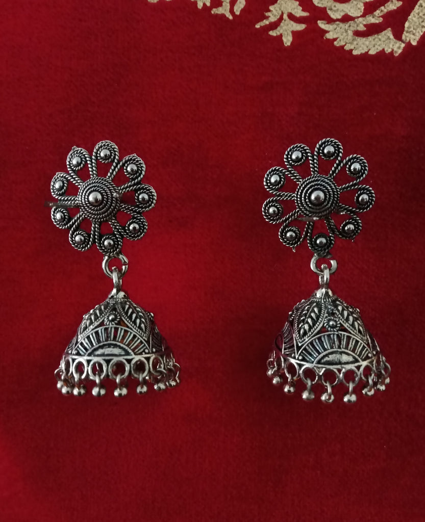 E0618_Lovely German Silver oxidized crafted jumkas with flower design with a touch of bead drops(ear drop hangings).
