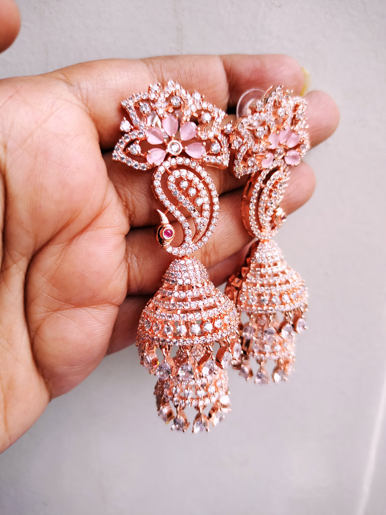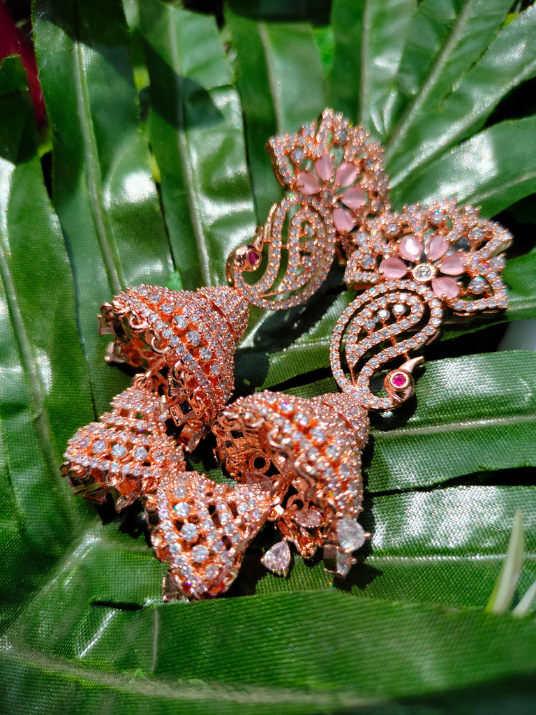E0869_Ravishing grand layered peacock design rose gold jumkas with delicate stone work.