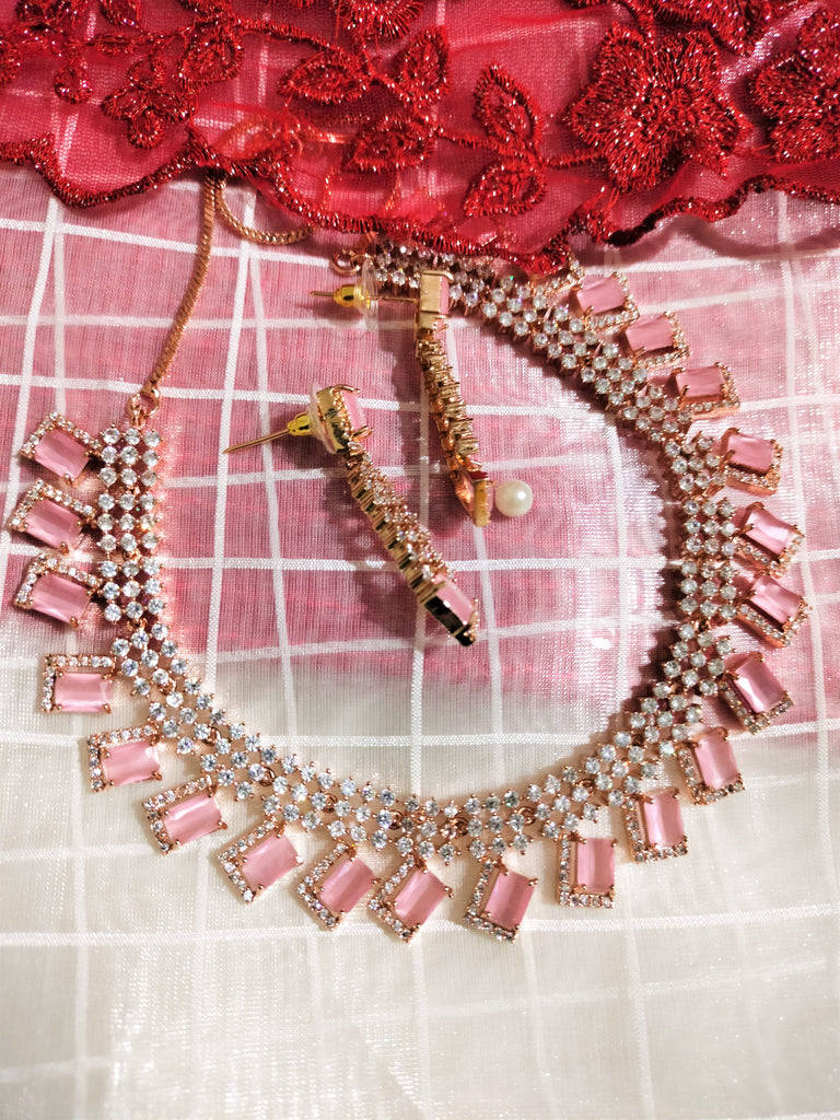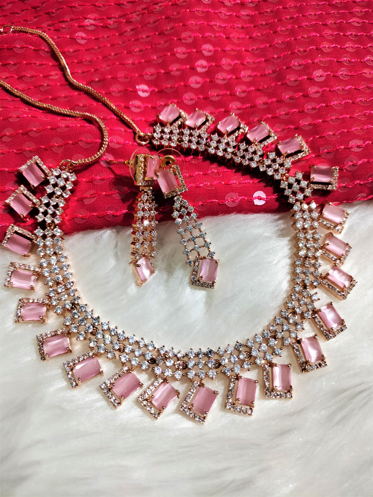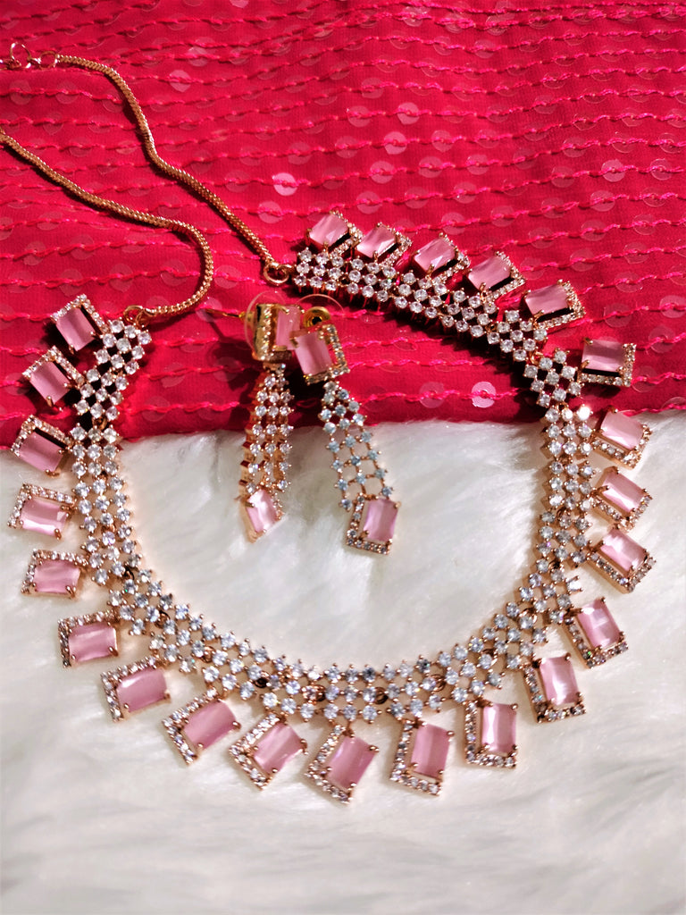 N01115_Lovely designer Rose polished choker necklace embellished with American diamond stones with delicate pink stone work.