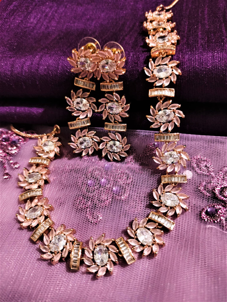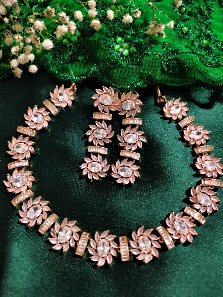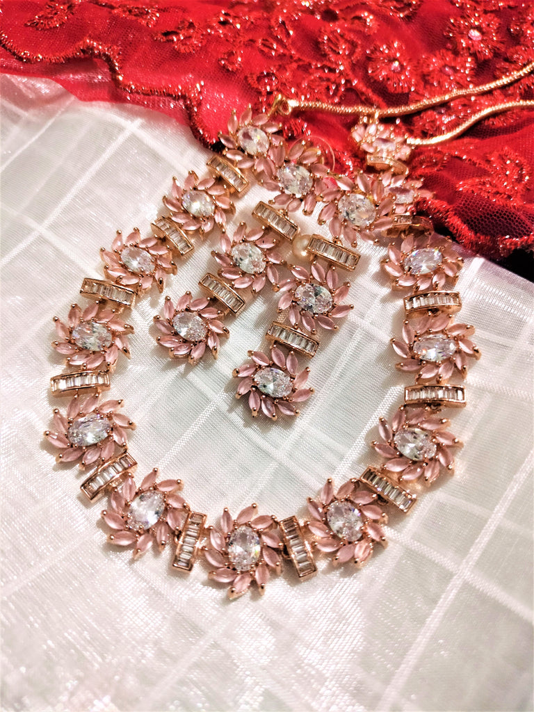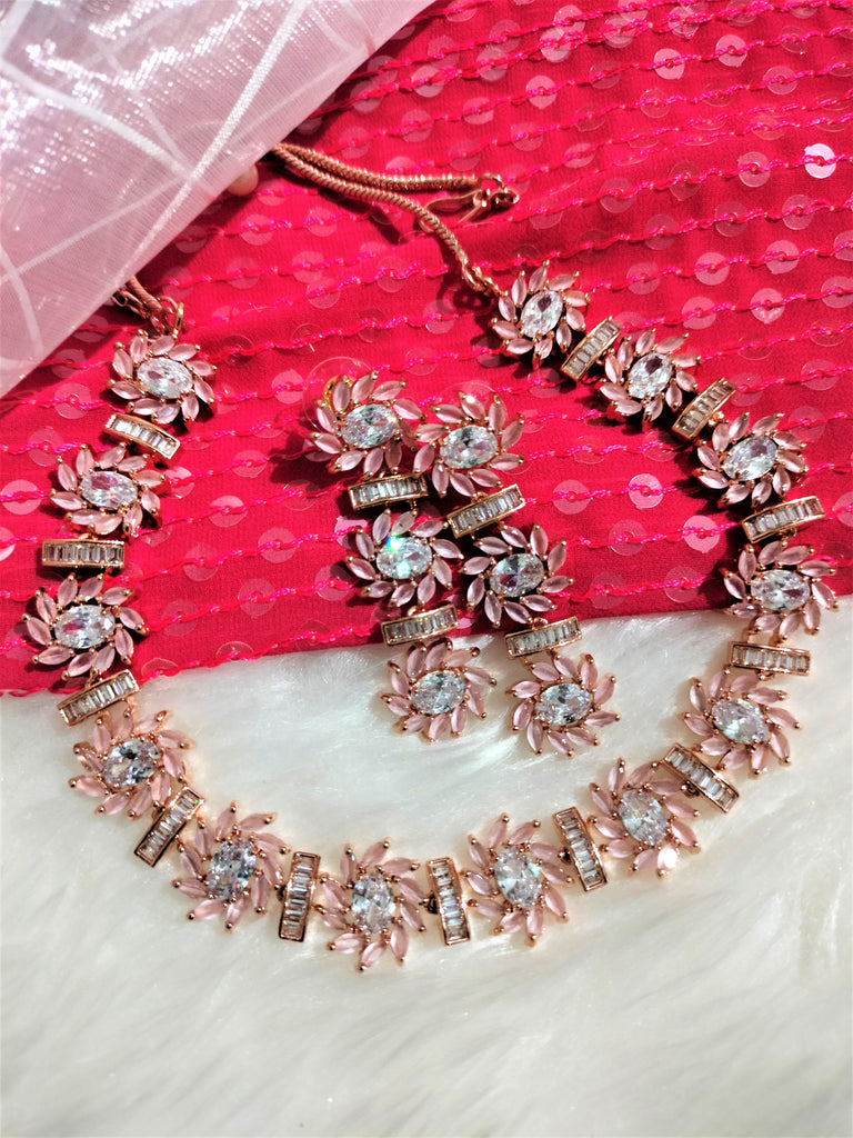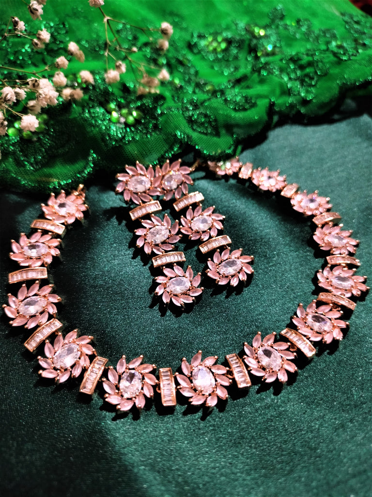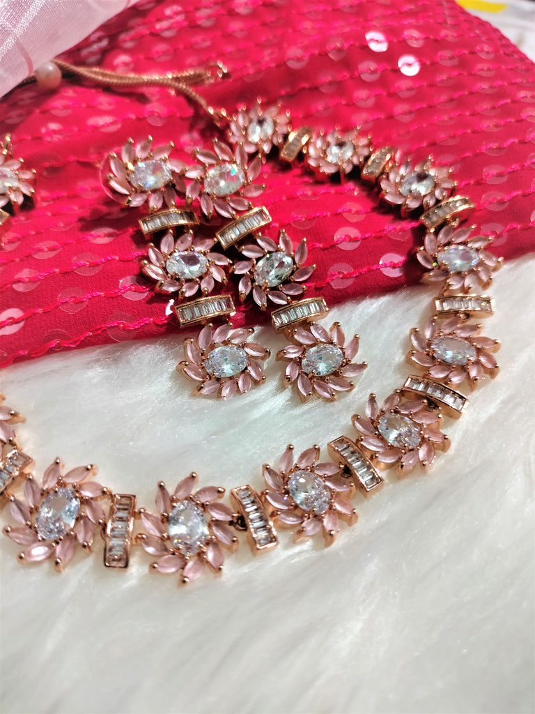 N01117_Lovely designer Rose polished choker necklace embellished with American diamond stones with delicate pink stone work.