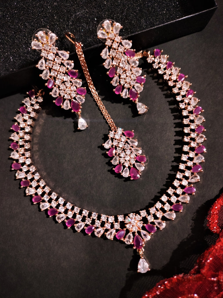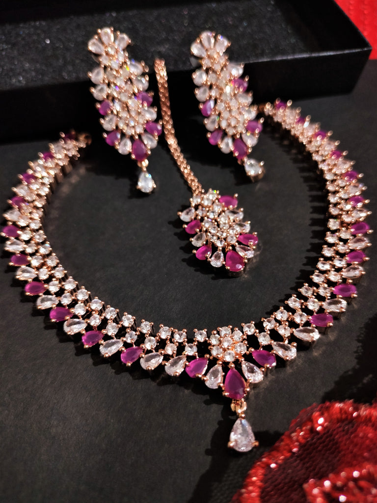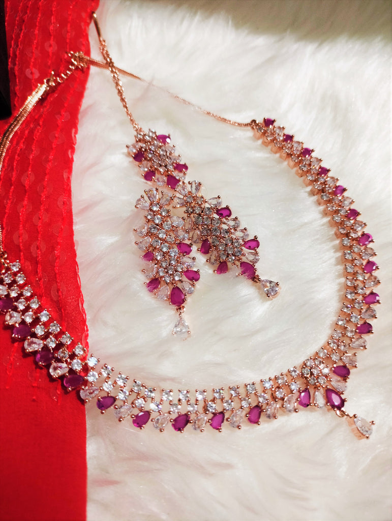 N01128_Lovely designer Rose polished choker necklace embellished with American diamond stones with delicate pink stone work.