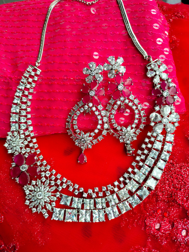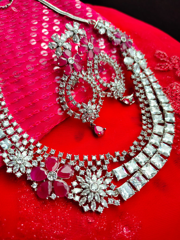 N01135_Lovely designer Rodium polished choker necklace embellished with American diamond stones with delicate white and Rani Pink stone work.