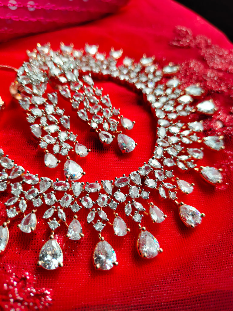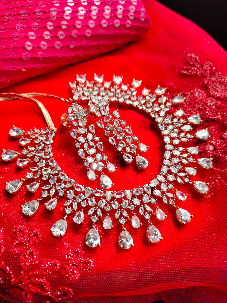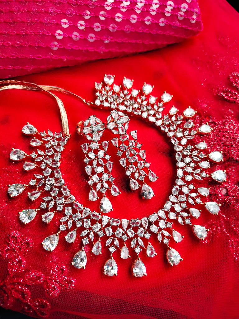 N01136_Grand Lovely designer Rose gold polished choker necklace embellished with American diamond stones with delicate white stone work.