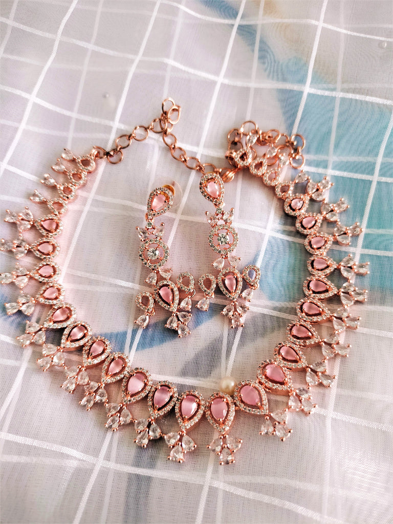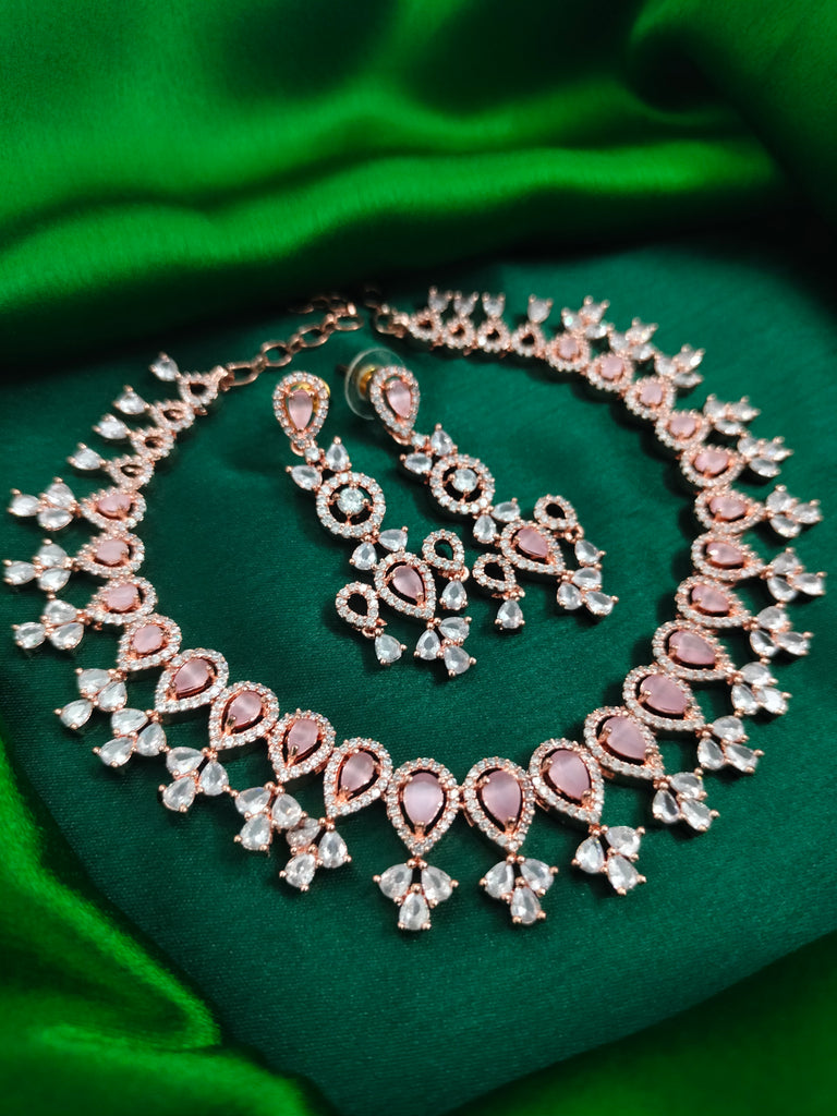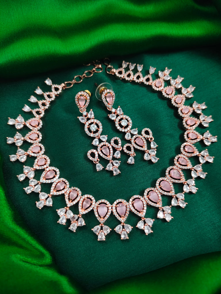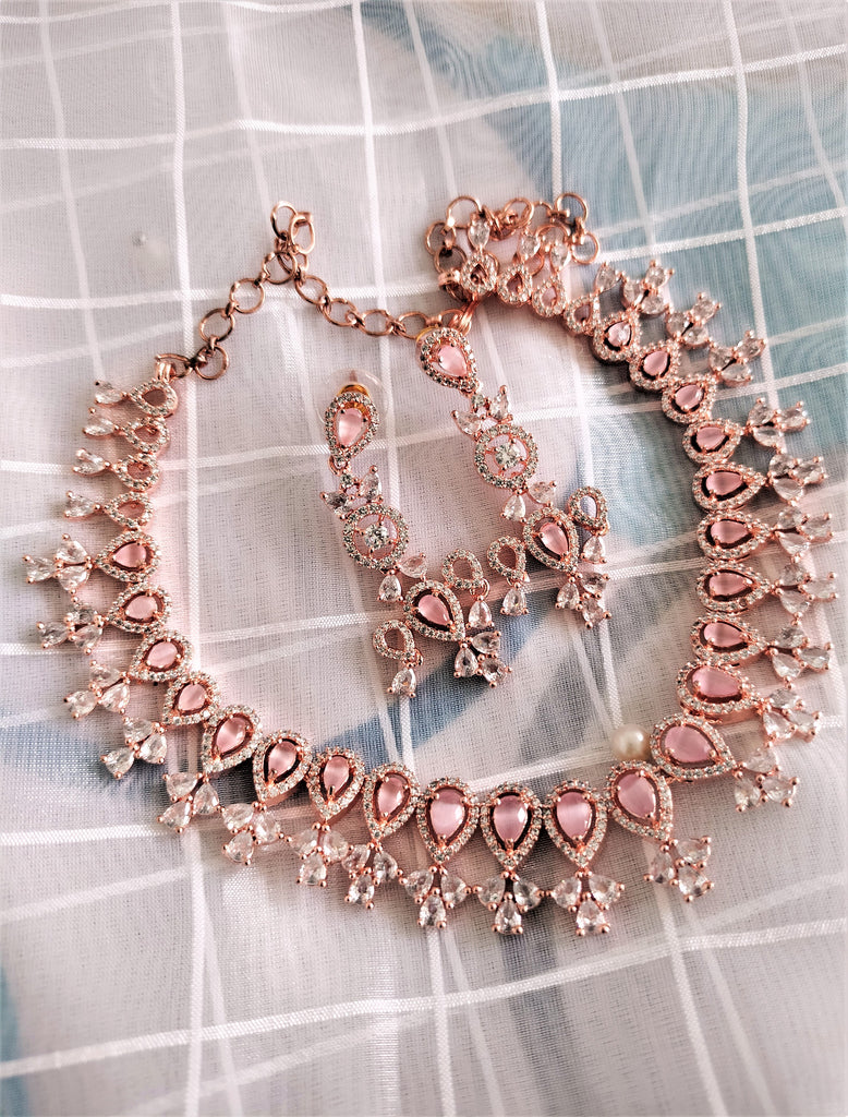 N01149_Grand Lovely designer Rose Gold polished choker necklace embellished with American diamond stones with delicate Baby Pink Stones work.