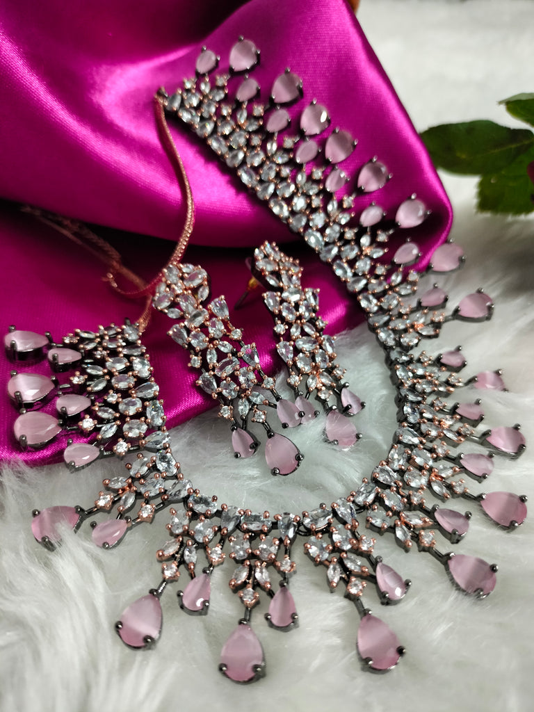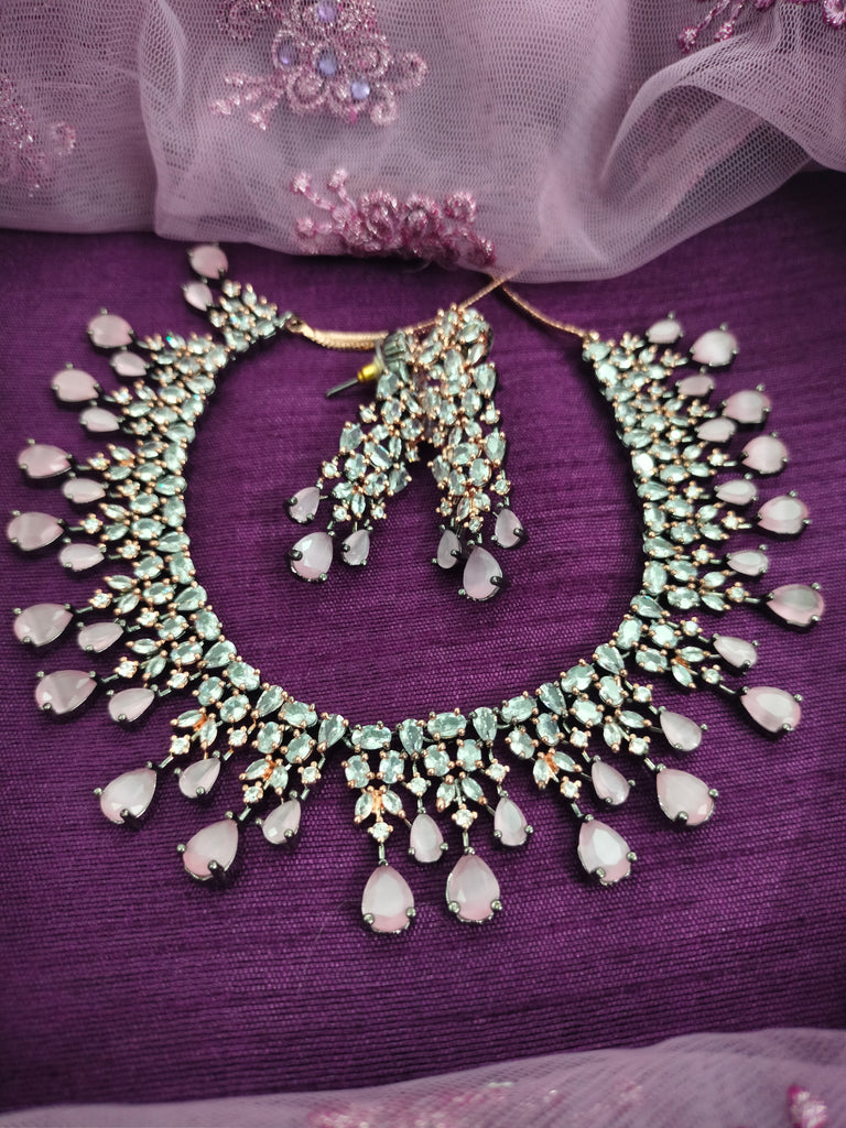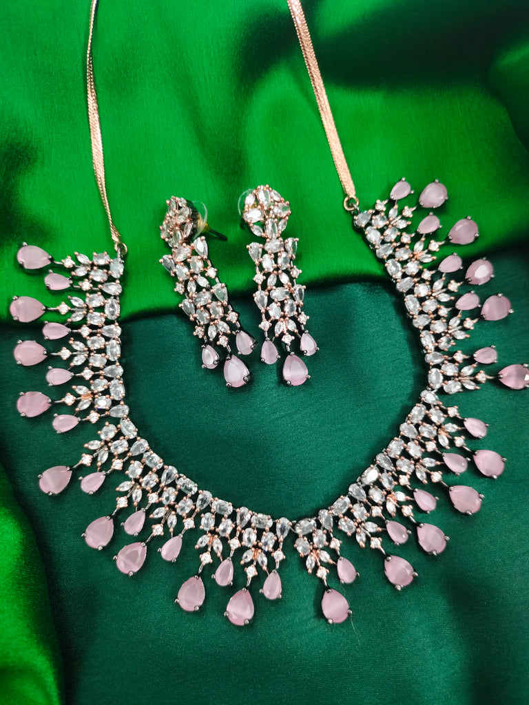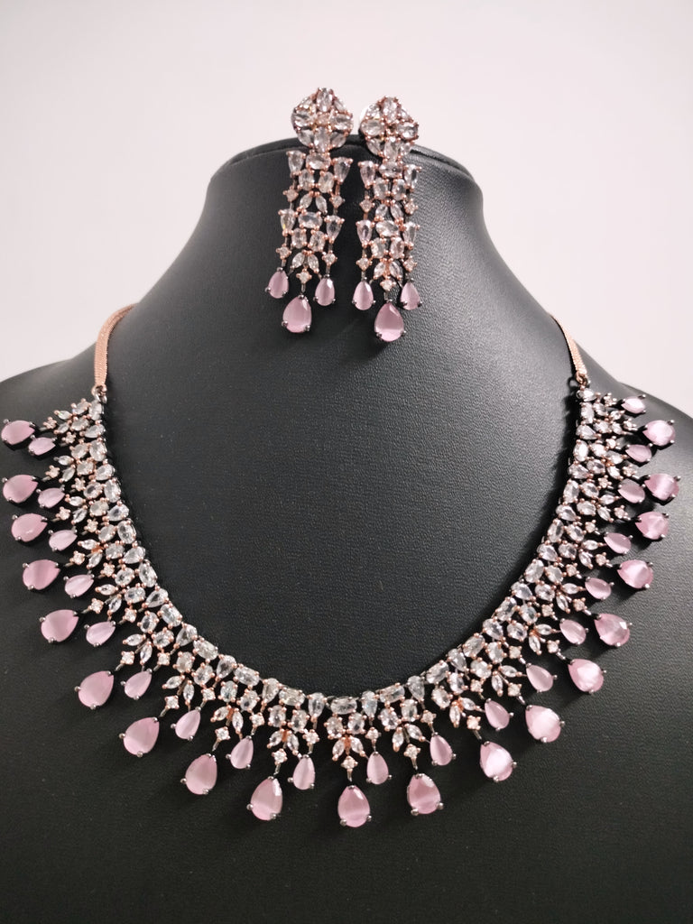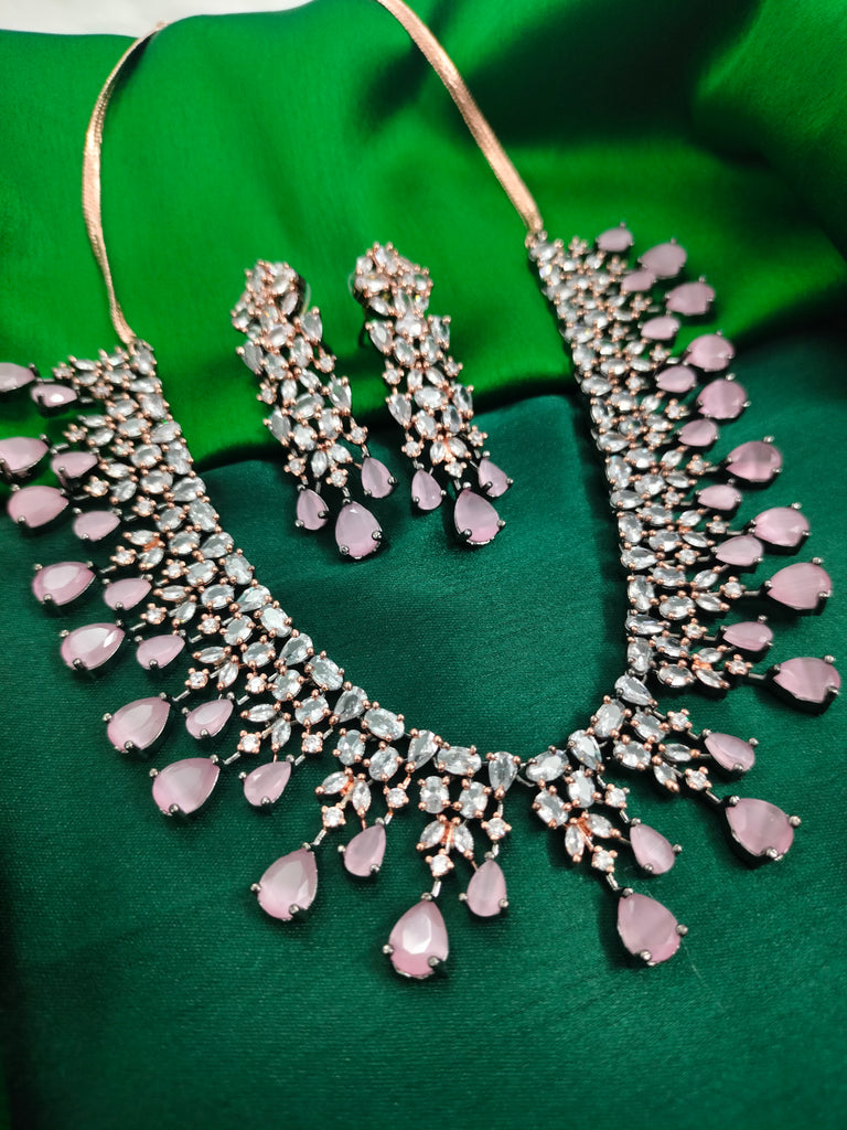 N01152_Grand Lovely designer Rose Gold & Metallic polished choker necklace embellished with American diamond stones with delicate Baby Pink Stones work.