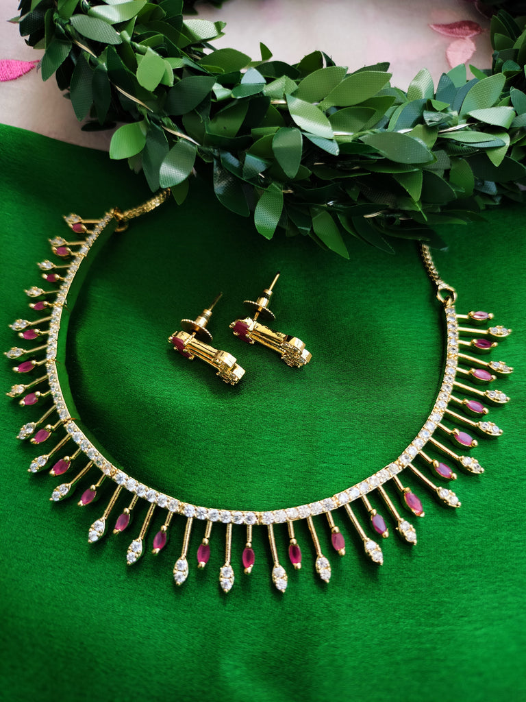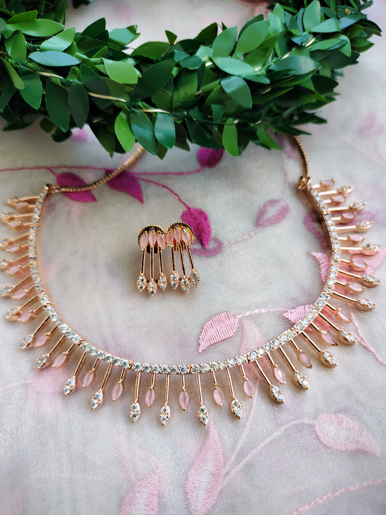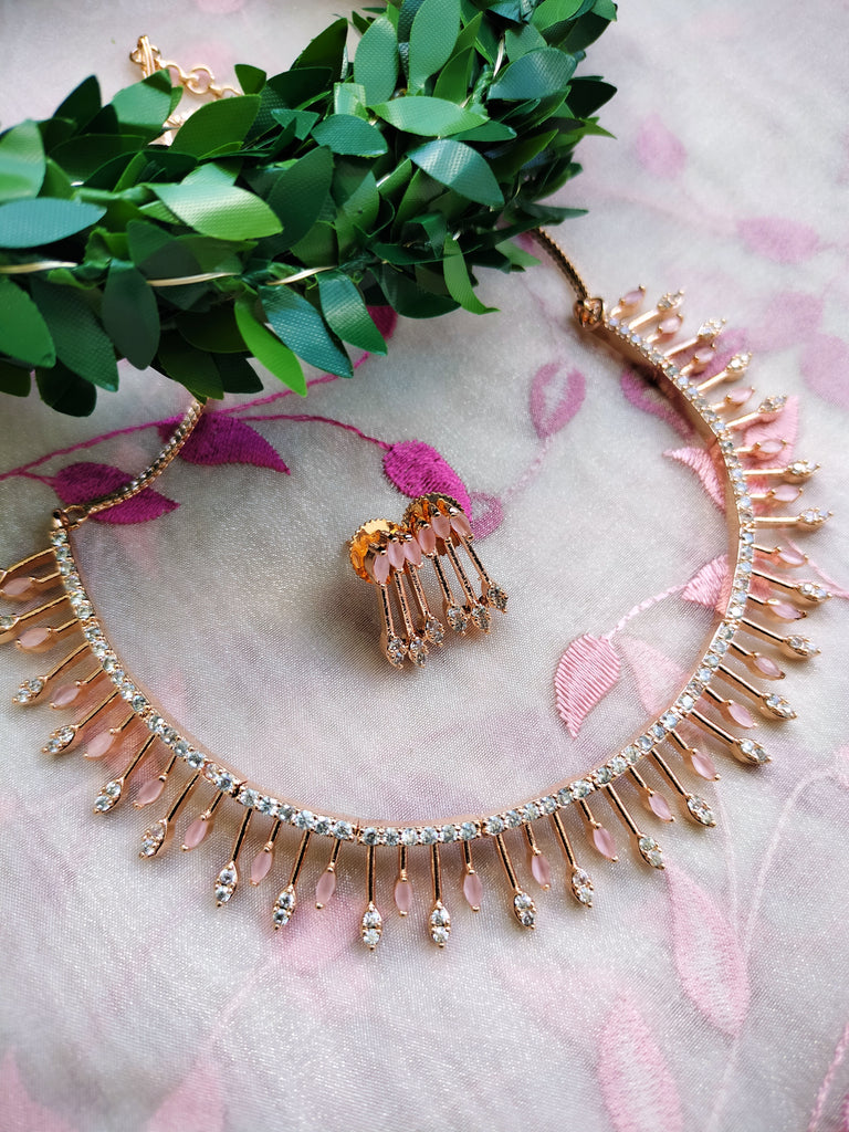 N01169_Grand Lovely designer Rose Gold polished choker Necklace Set embellished with American diamond stones with delicate Baby Pink Stones work.
