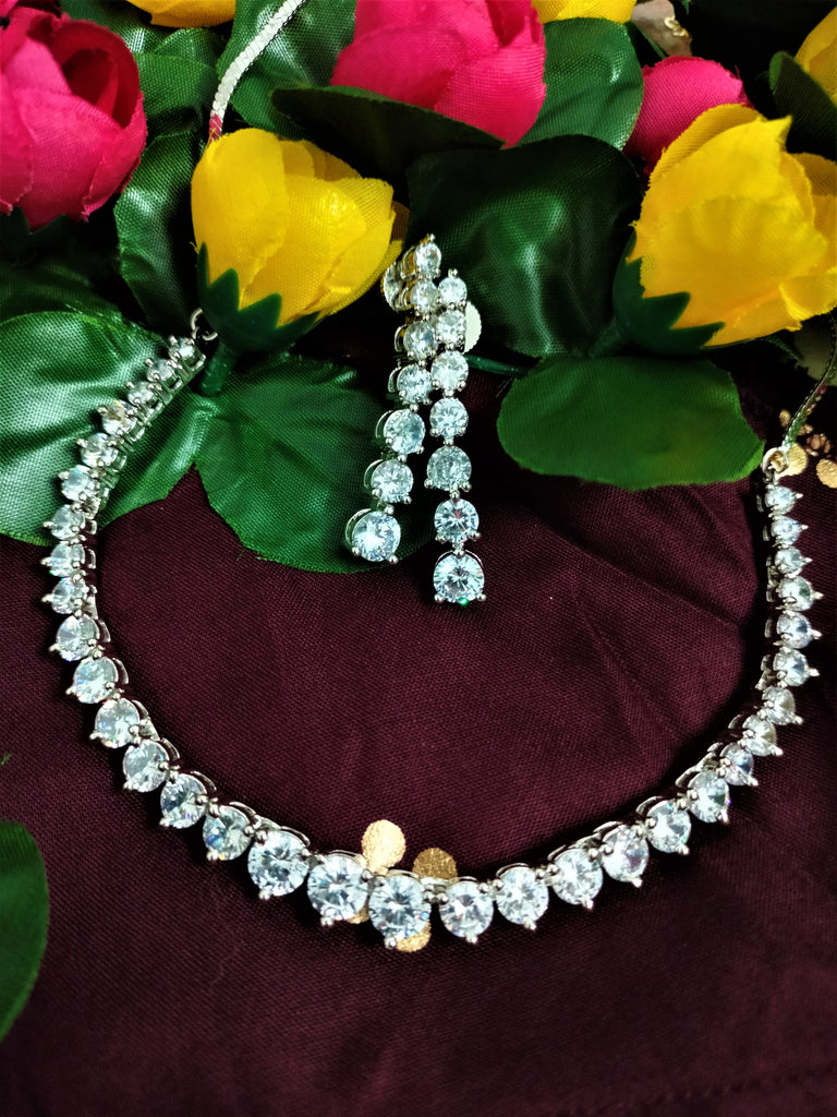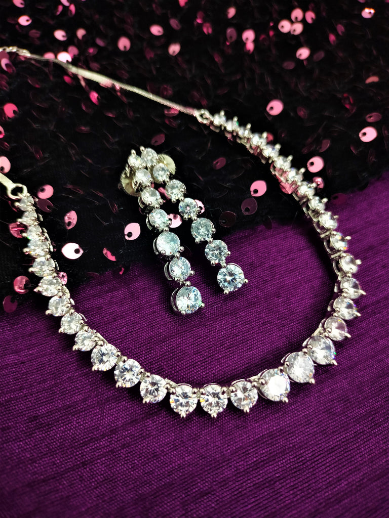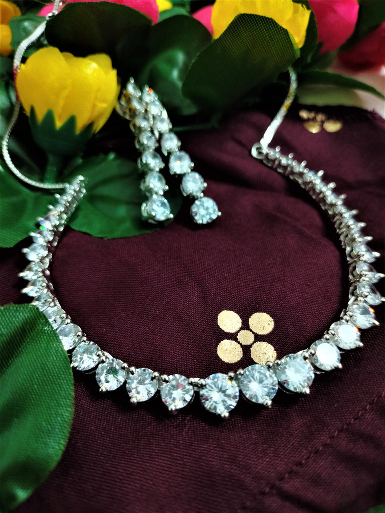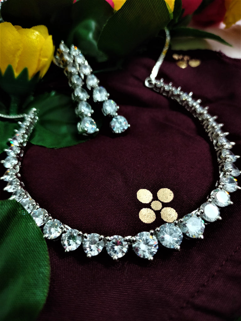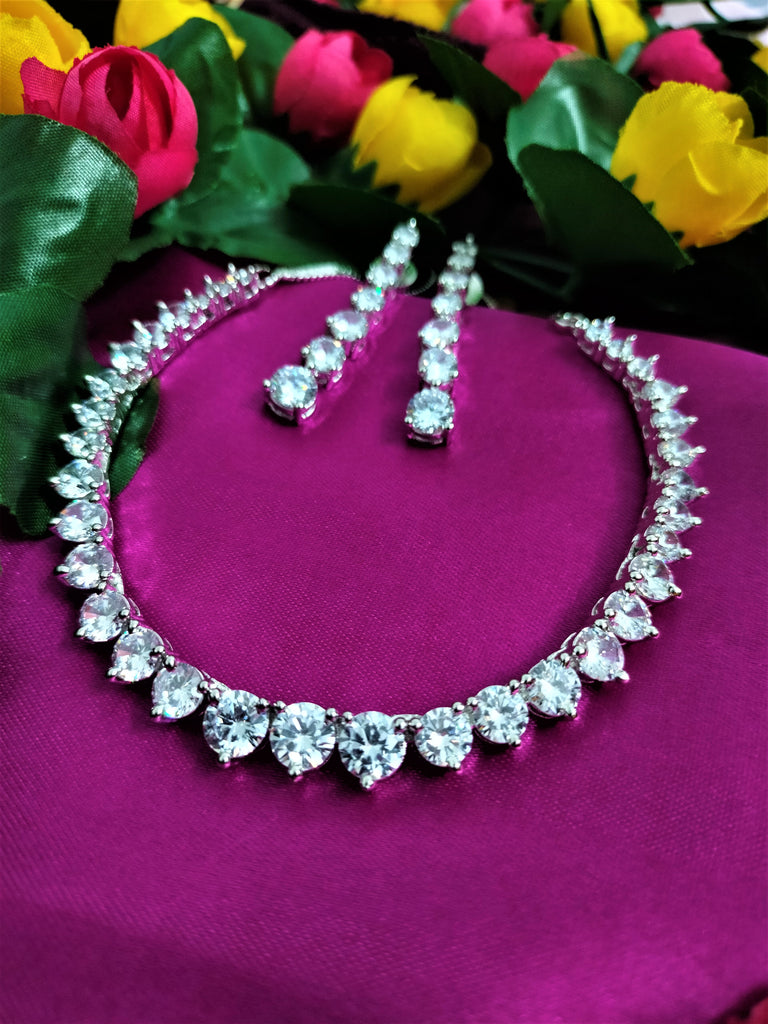 N01176_Grand Lovely designer Silver polished Necklace Set embellished with American diamond stones with delicate white Stones .