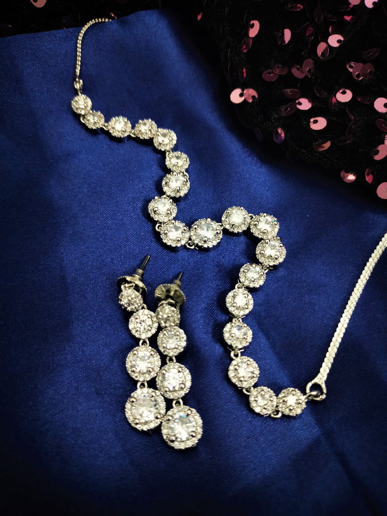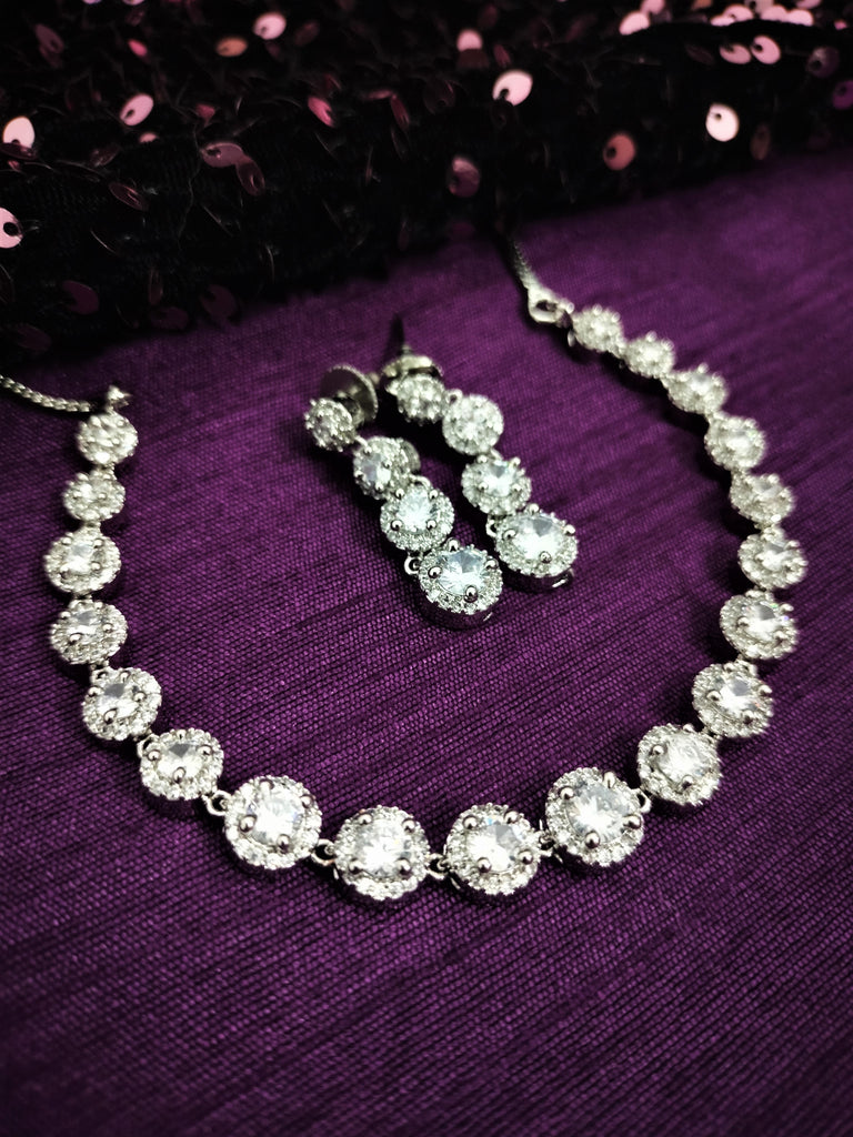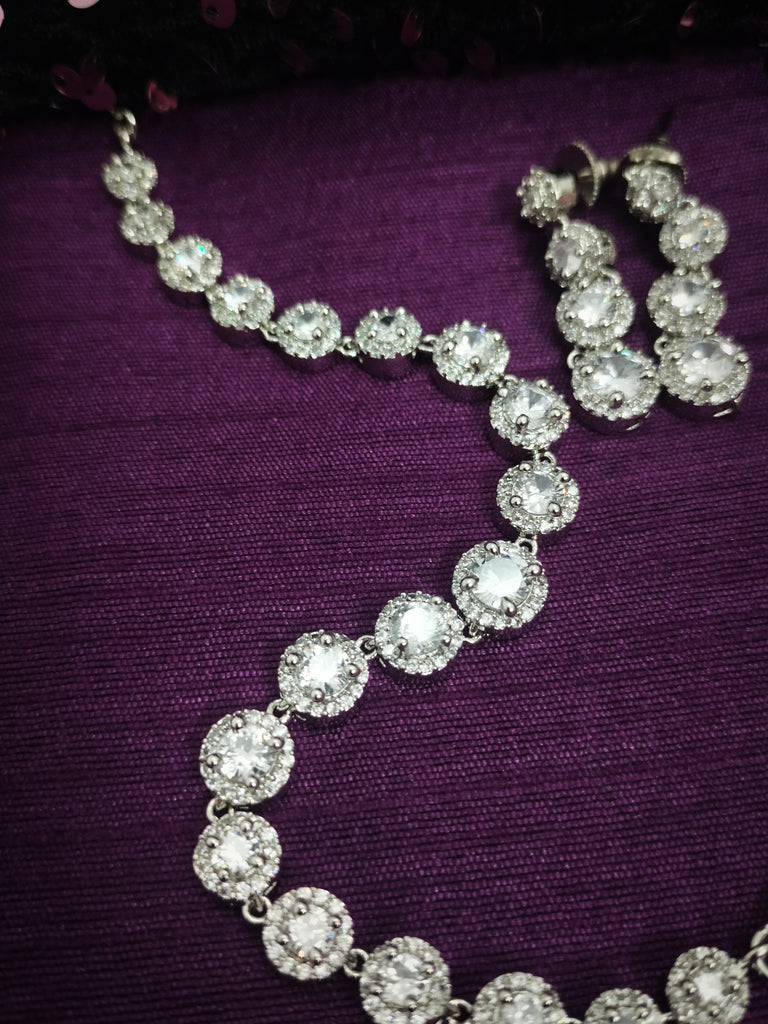 N01177_Grand Lovely designer Silver polished Necklace Set embellished with American diamond stones with delicate white Stones .