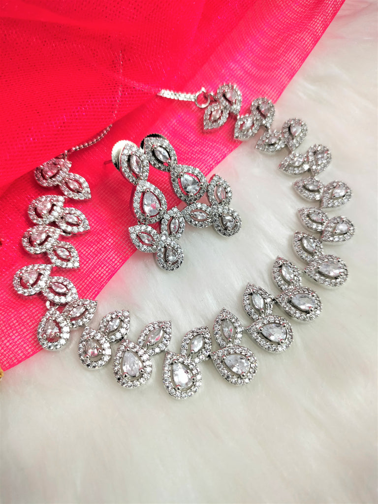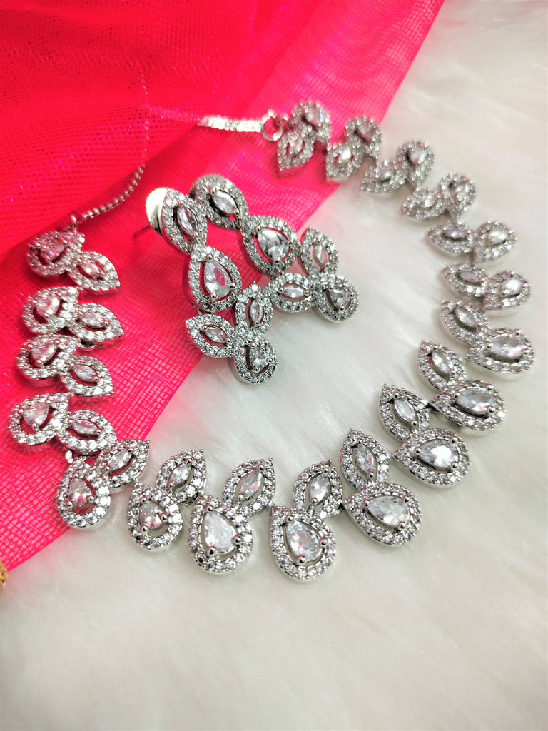 N01182_Grand Lovely designer Silver polished Necklace Set embellished with American diamond stones with delicate white Stones .