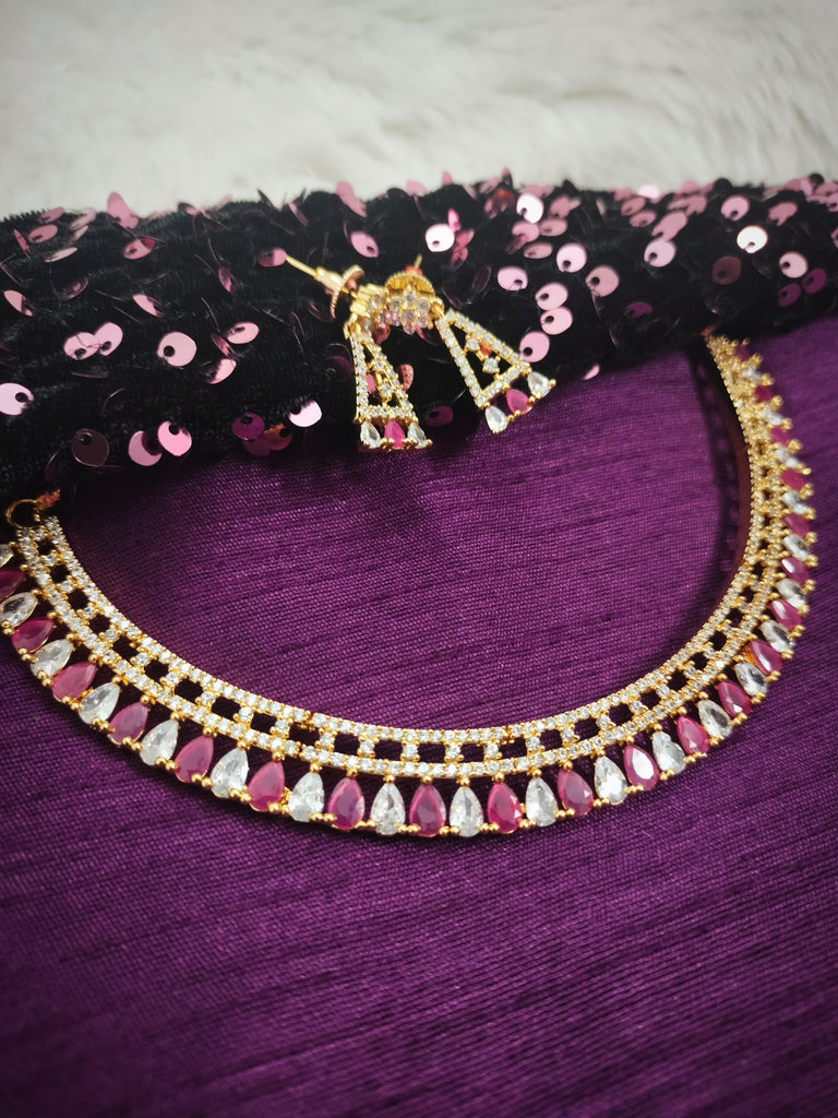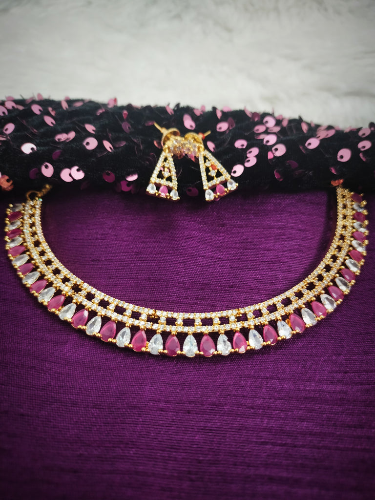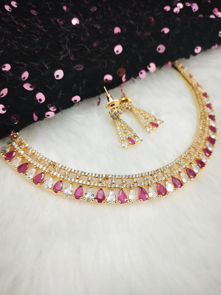 N01188_Grand Lovely designer Gold polished Necklace Set embellished with American diamond stones with delicate Dark Pink Stones .