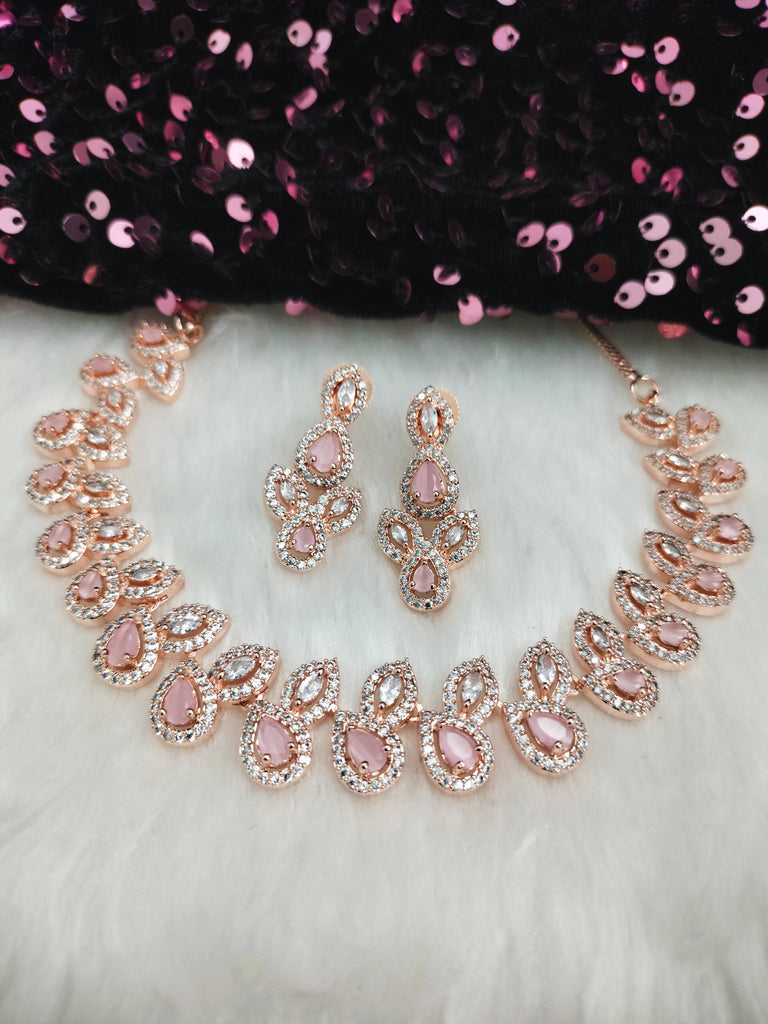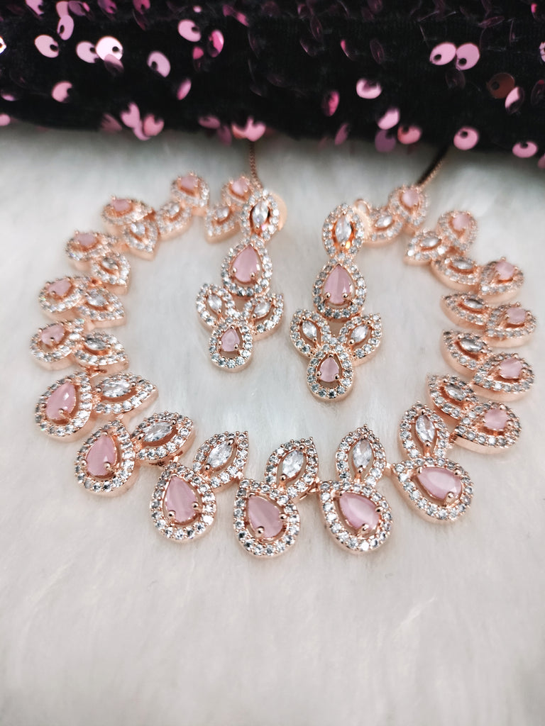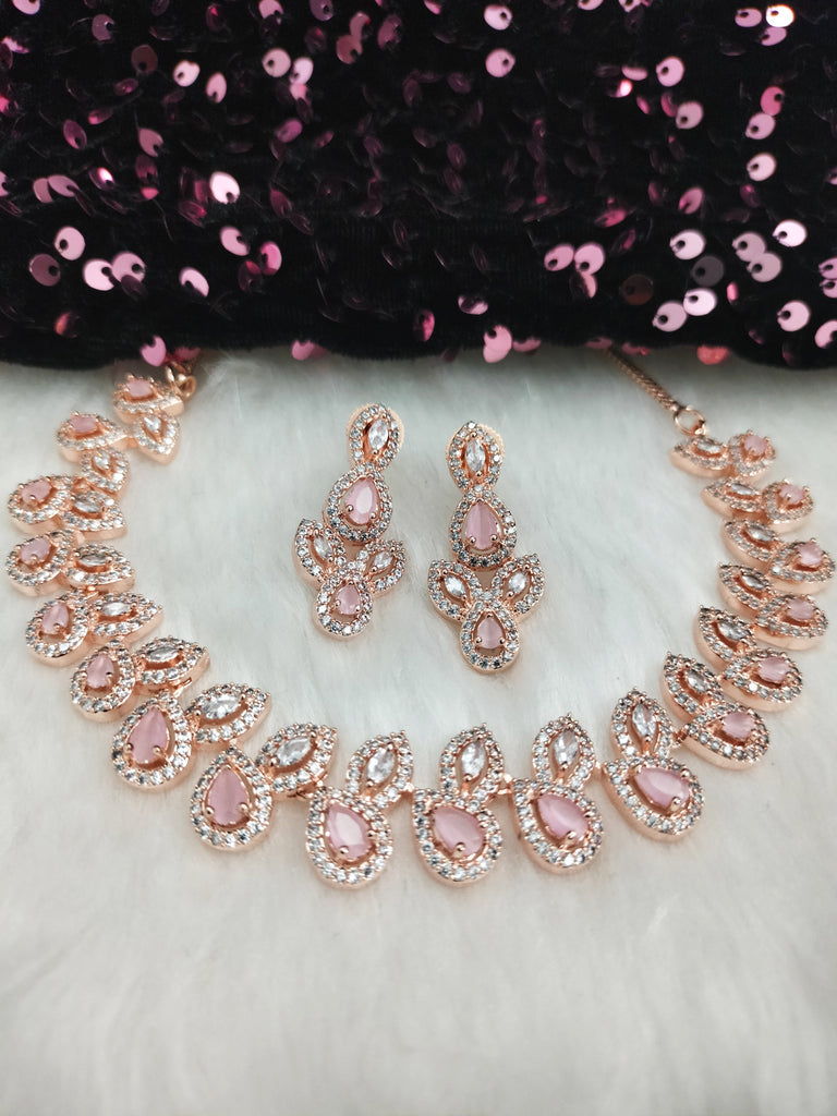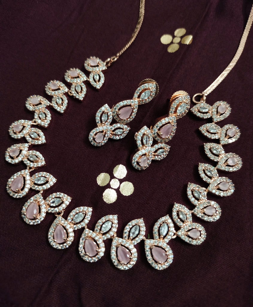 N01188_Grand Lovely designer Rose Gold polished Necklace Set embellished with American diamond stones with delicate Pink Stones .