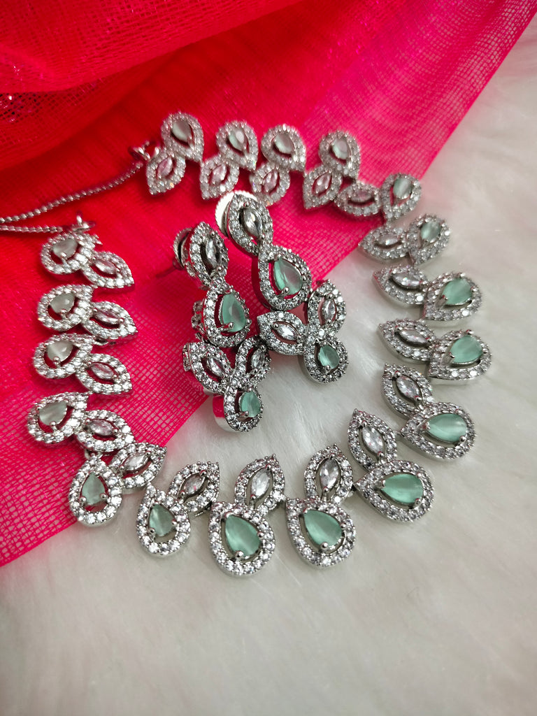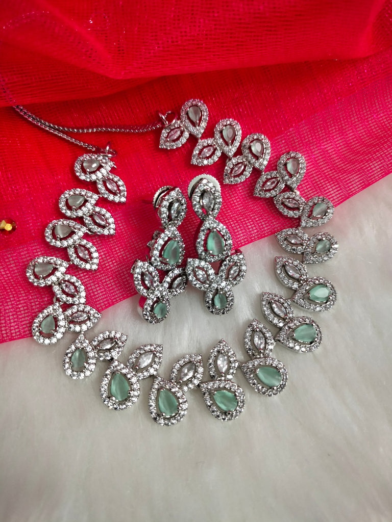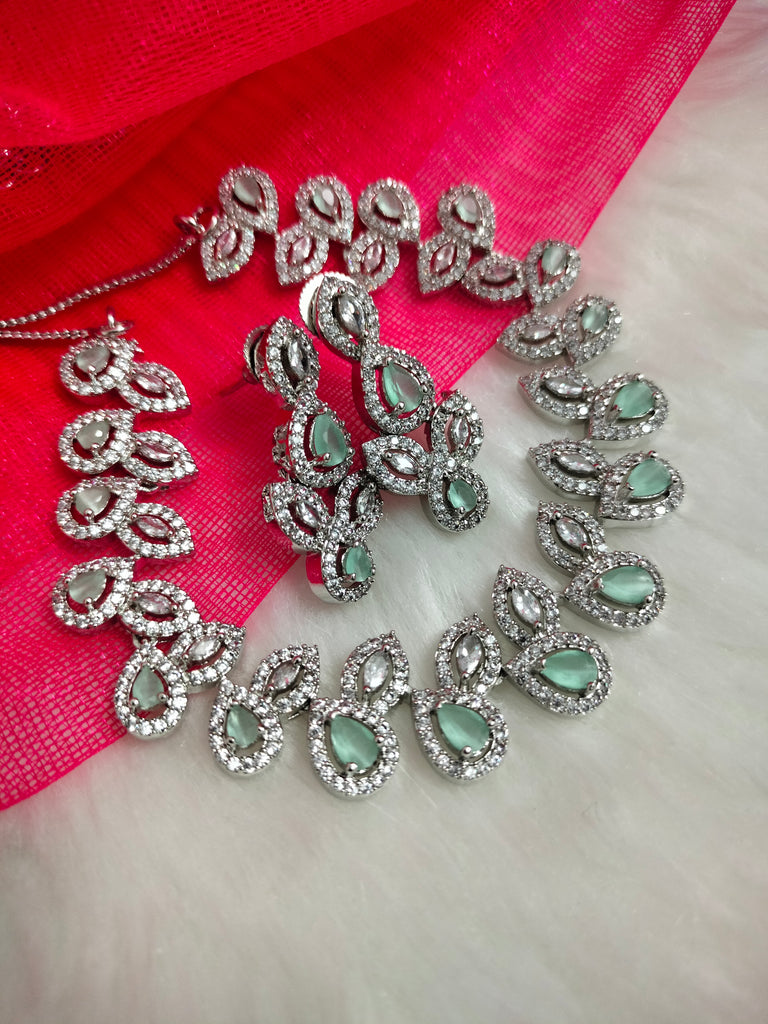 N01191_Grand Lovely designer Silver polished Necklace Set embellished with American diamond stones with delicate Mint Green Stones .
