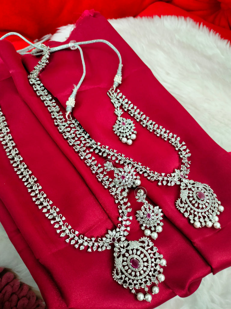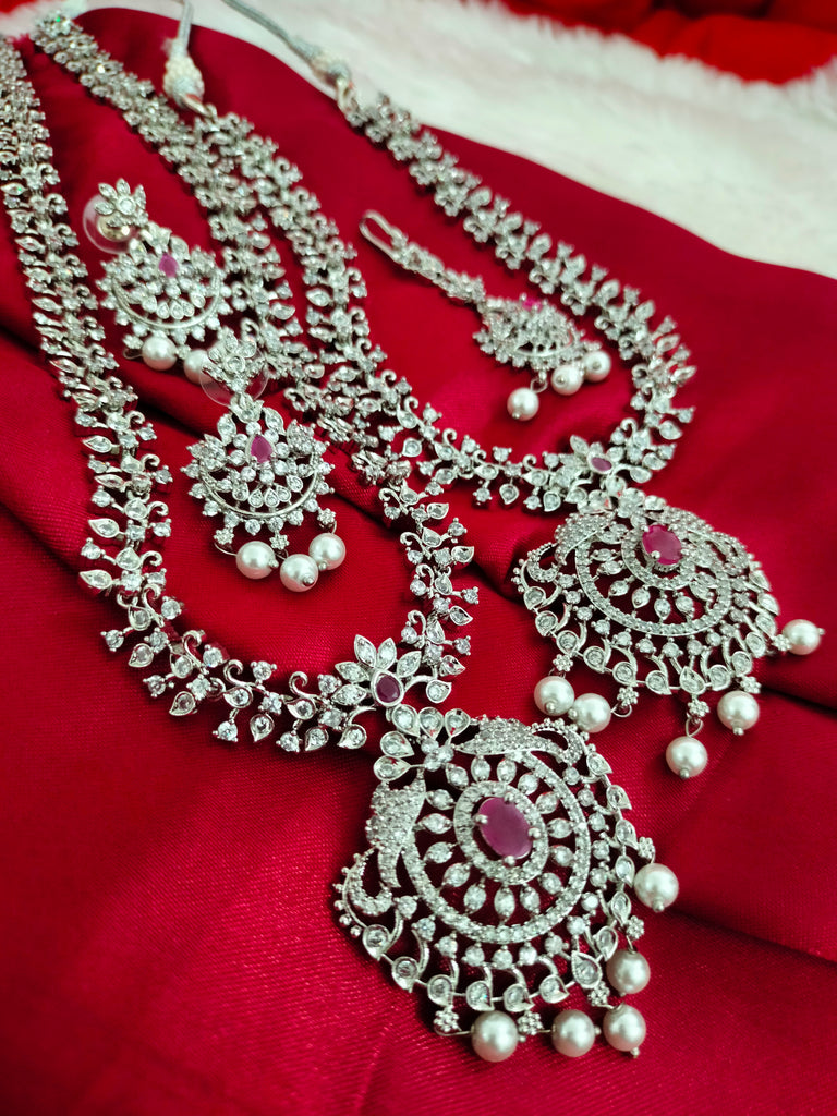 N01203_Elegant design Silver Polished American Diamond choker necklace studded with beautiful dazzling stones with delicate pink work.