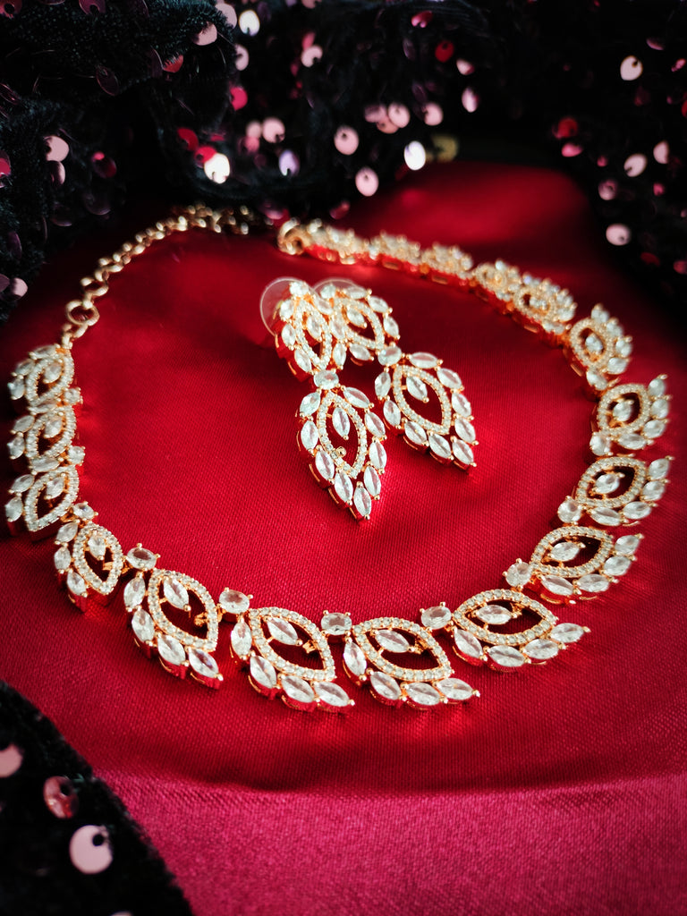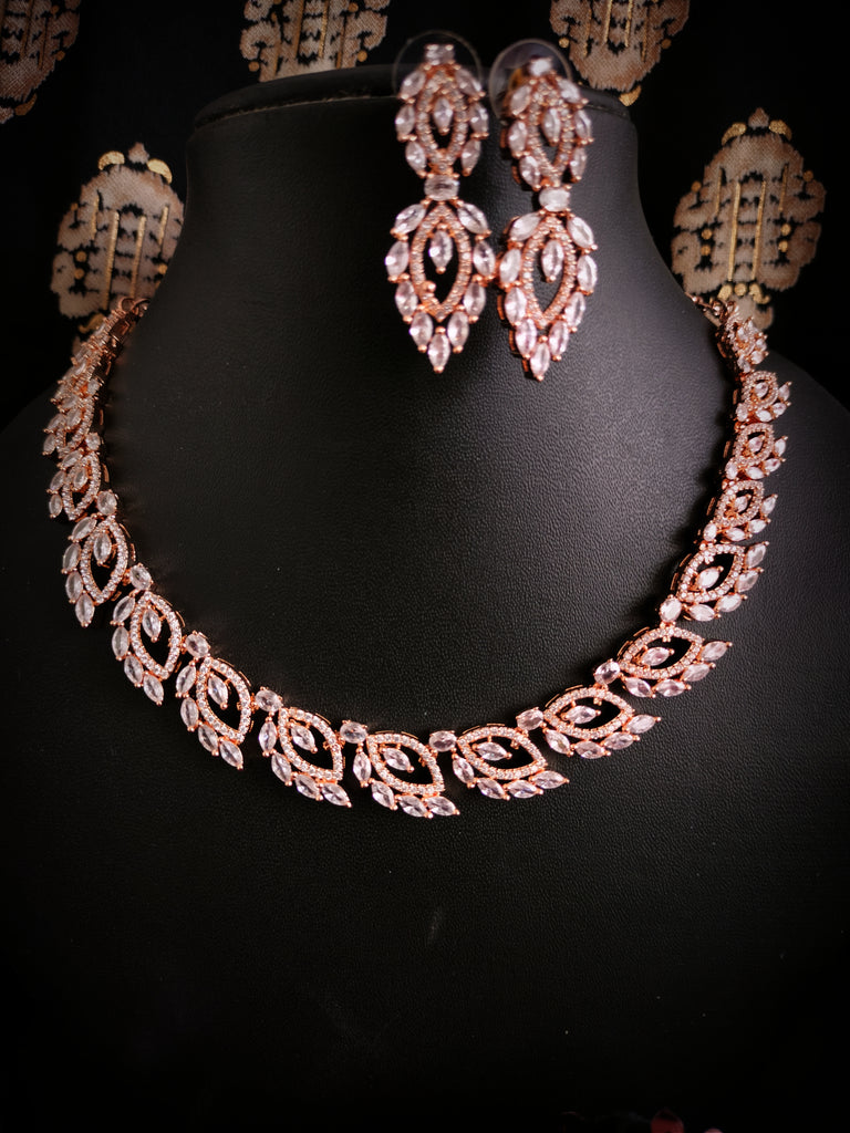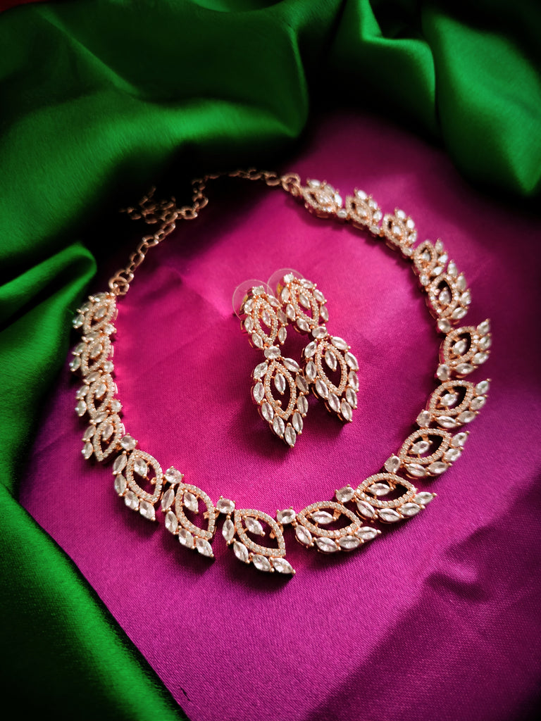 N02004_Classic Rose gold polished choker style flower crafted design necklace set embellished with white stones .