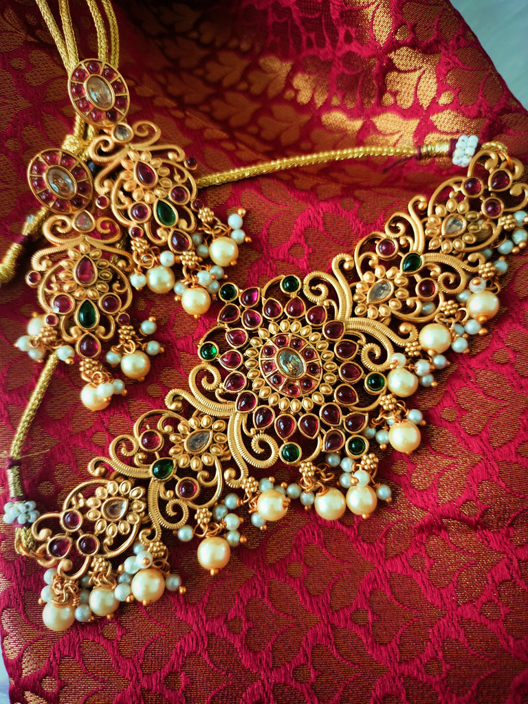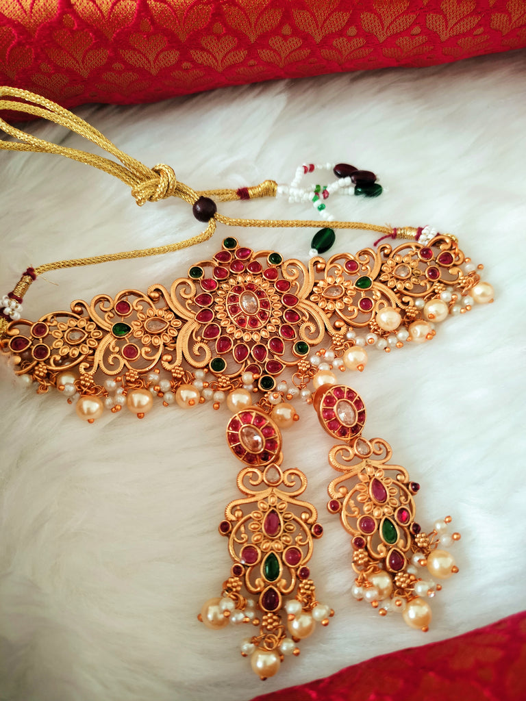 N03038_ classic matte gold polished temple jewelry choker style crafted design gold plated necklace set embellished with ruby and green stones .