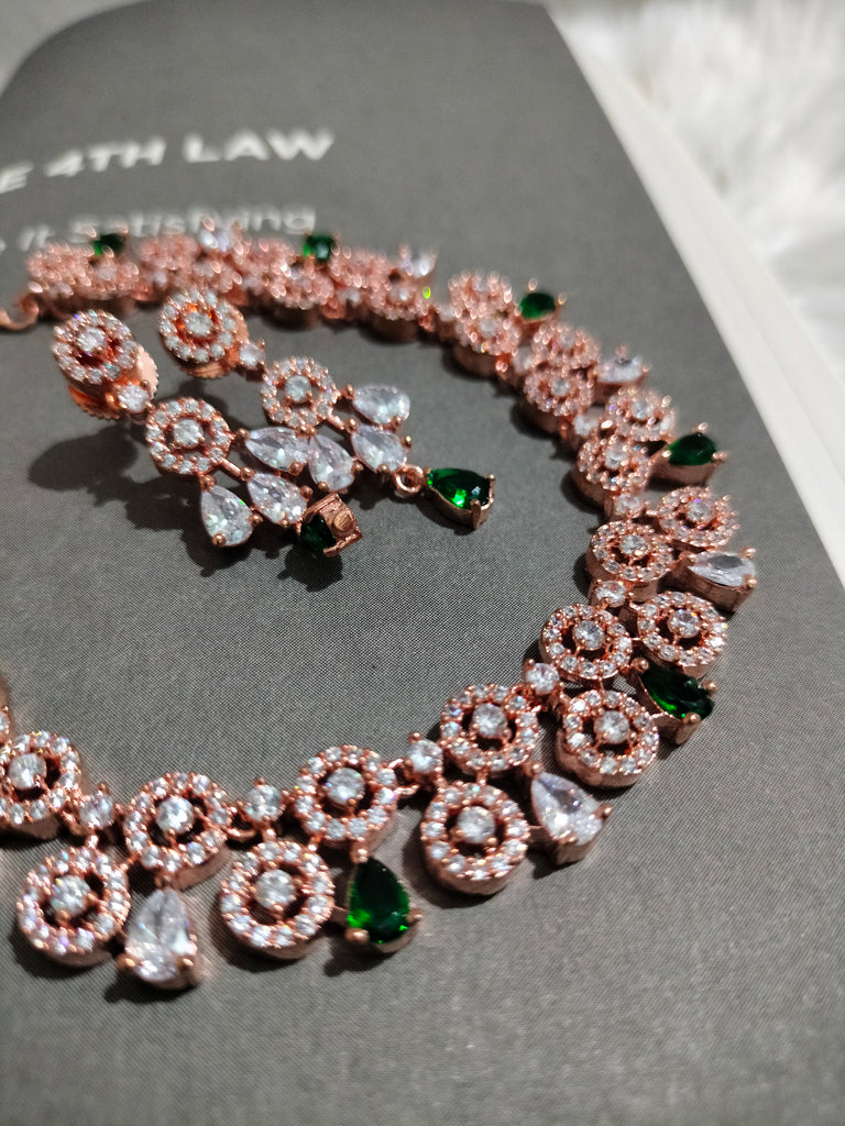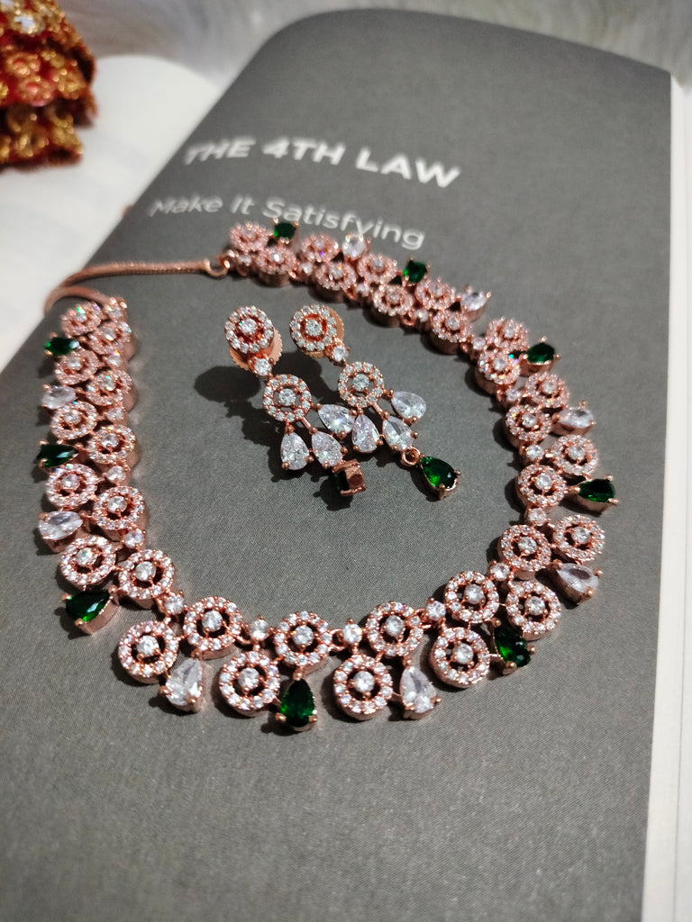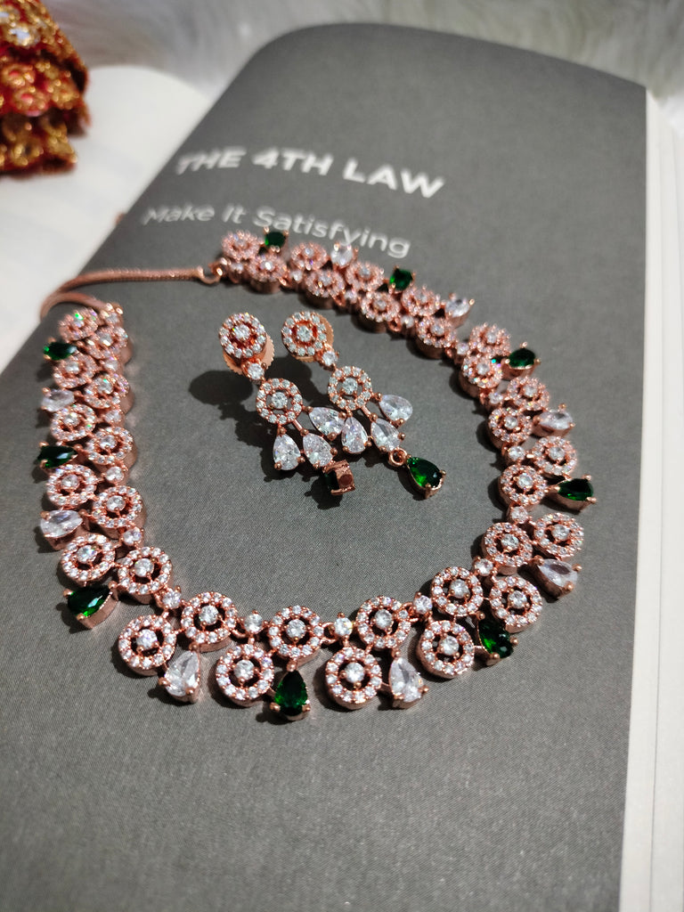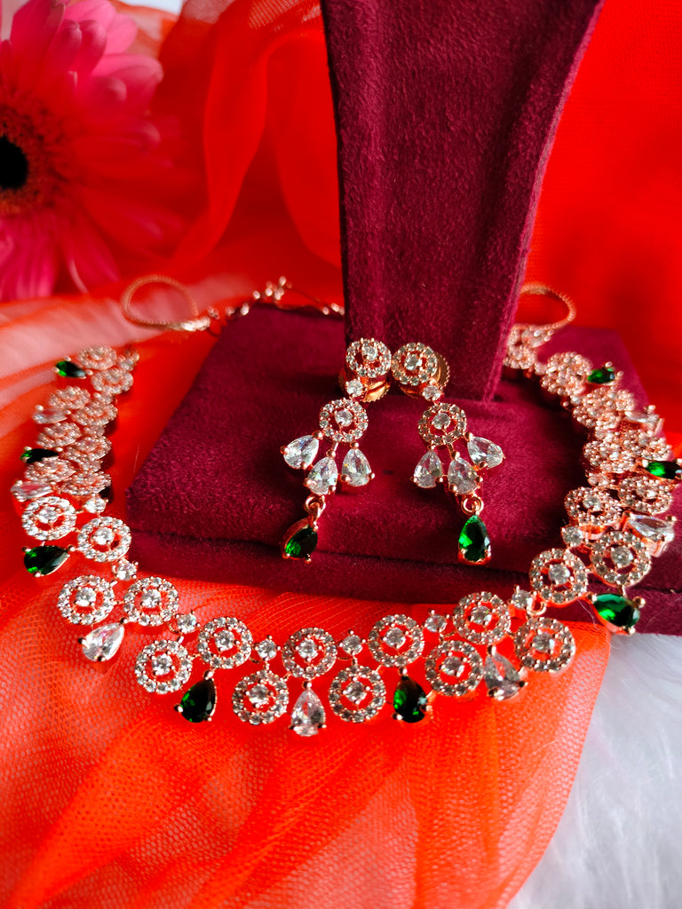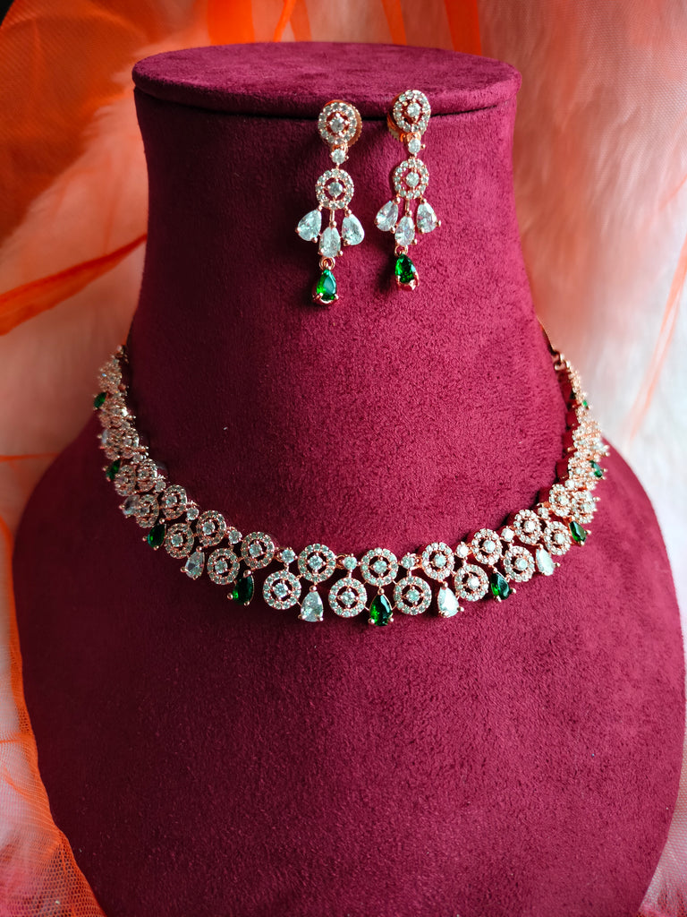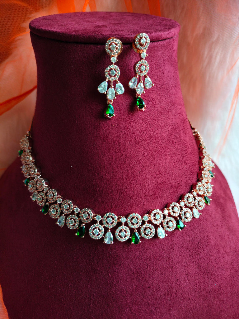 N0437_Elegant american diamond embellished necklace with a touch of green stone work.