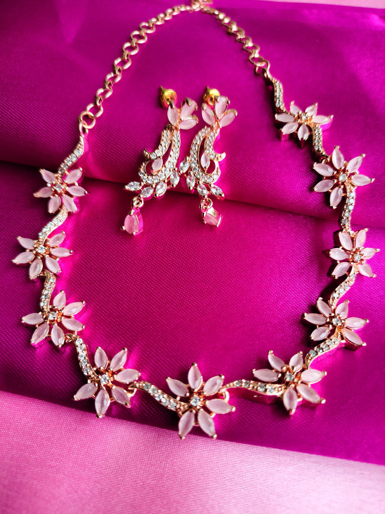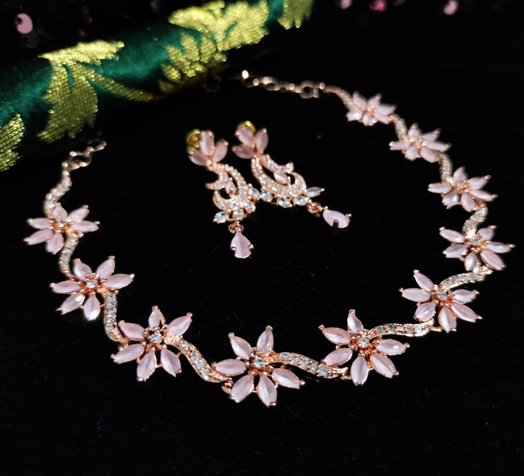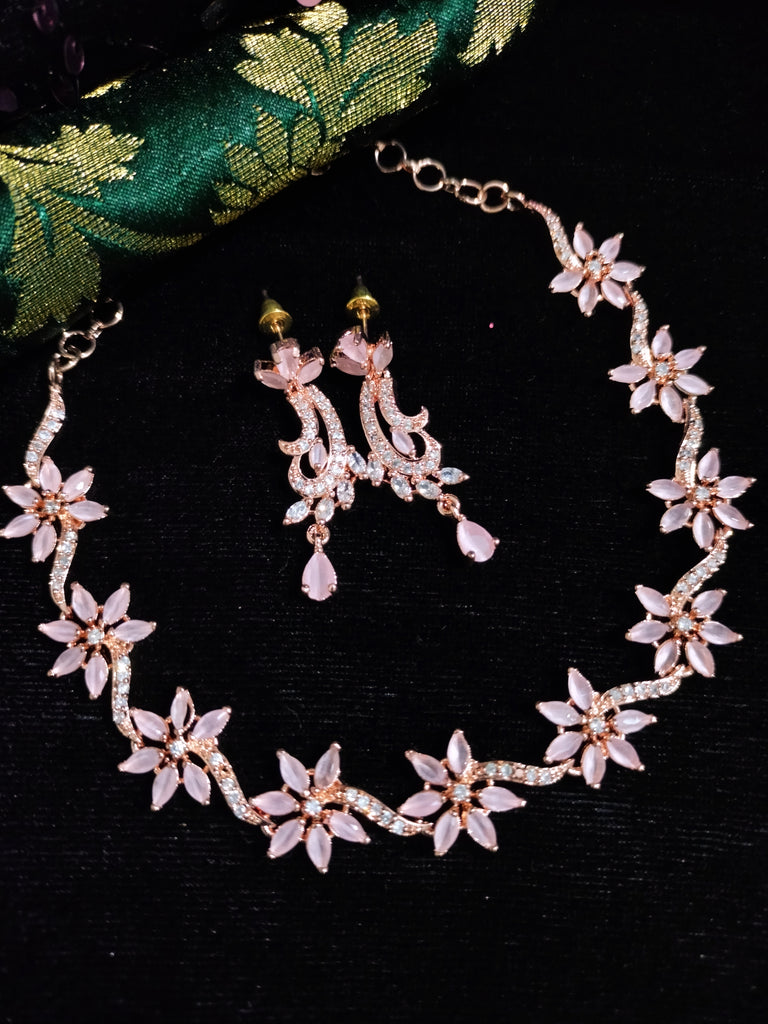 N0488_Lovely flower design american diamond studded choker necklace set with a touch of pink stones.