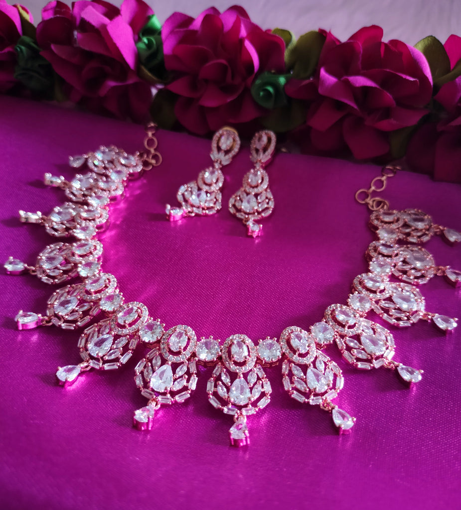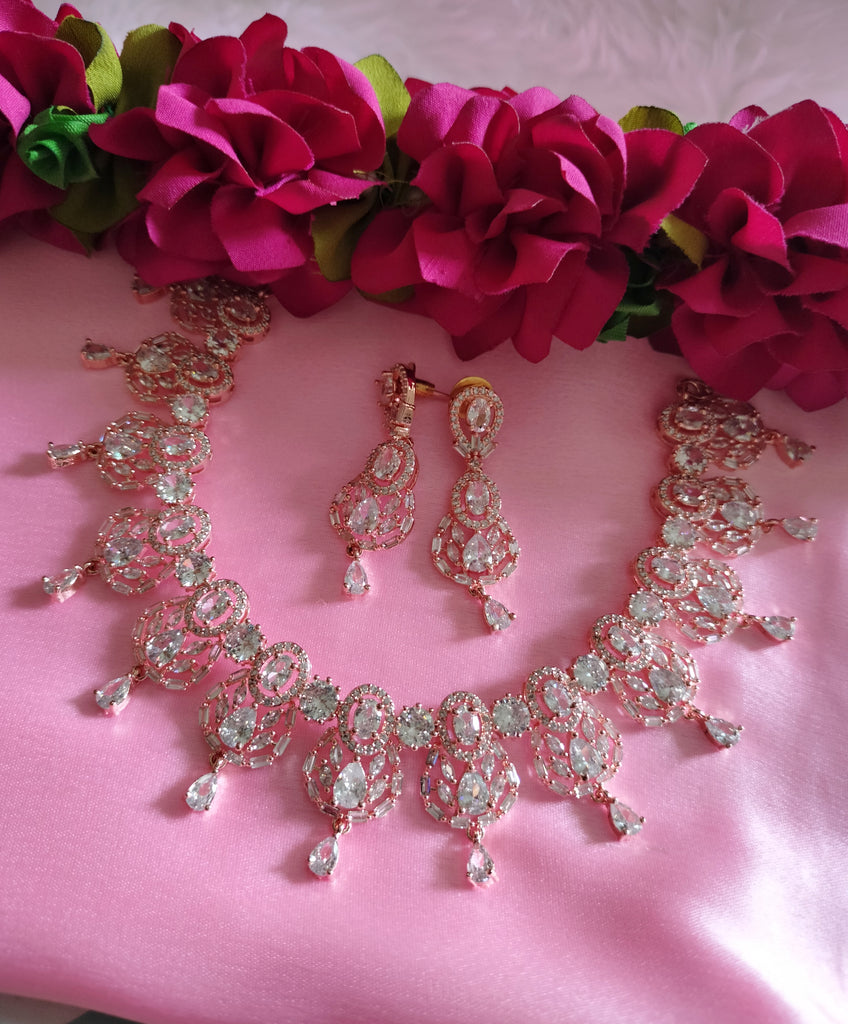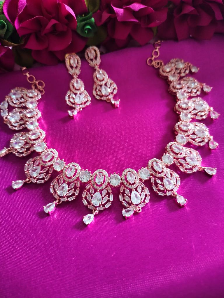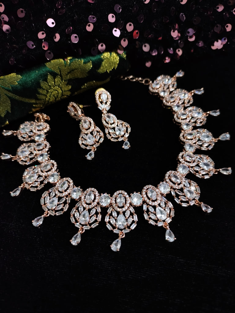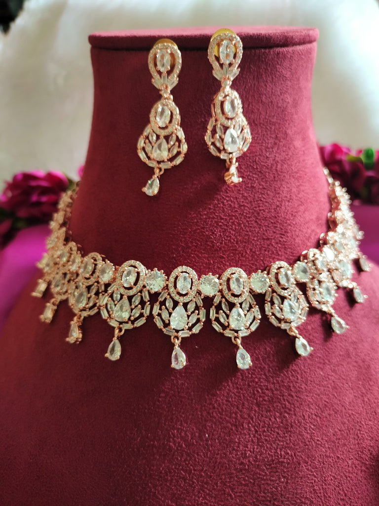 N0492_Elegant designer rose gold american diamond studded choker necklace set with delicate stone work.